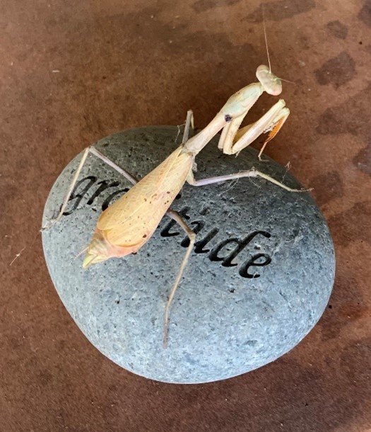 This praying mantis on our gratitude rock (see picture below) reminded Jim and me of how grateful we are for our health, a loving family, and a loving God. Even during these trying times, we consider ourselves thankful to be living in such a beautiful location with perfect weather and with support from wonderful friends from our church and community.