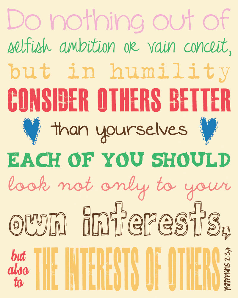 “If you’ve gotten anything at all out of following Christ, if his love has made any difference in your life, if being in a community of the Spirit means anything to you, if you have a heart, if you care— then do me a favor: Agree with each other, love each other, be deep-spirited friends. Don’t push your way to the front; don’t sweet-talk your way to the top. Put yourself aside, and help others get ahead. Don’t be obsessed with getting your own advantage. Forget yourselves long enough to lend a helping hand.” [Philippians 2:3-4 The Message]